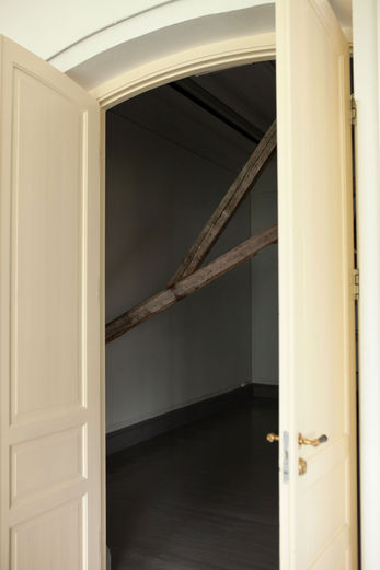 reclaimed hand carved wooden beams, bespoke steel brackets, sheets of acrylic, polarising filtre. Dimensions: 4 x 6 x 2 m
